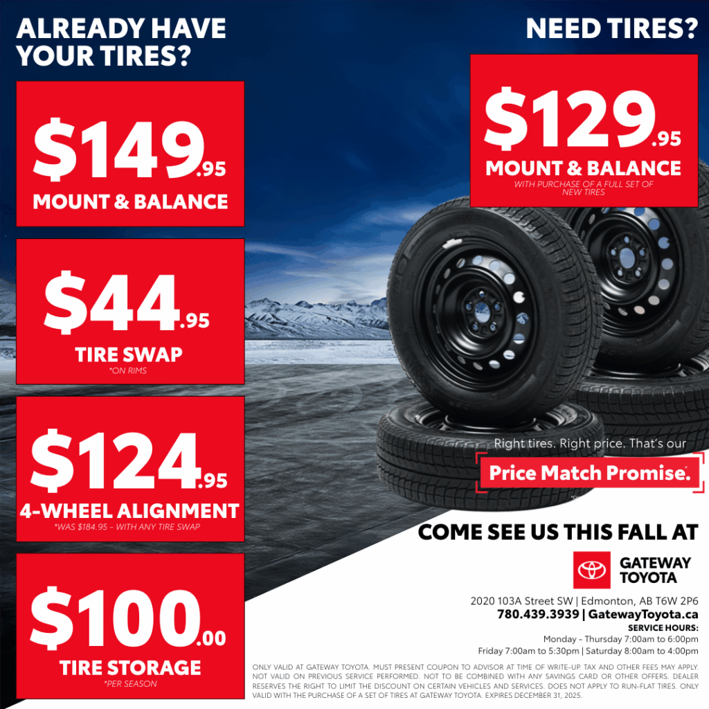 Disclaimer: Only valid at Gateway Toyota. Must present coupon to advisor at time of write-up. Tax and other fees may apply. Not valid on previous service performed. Not to be combined with any savings card or other offers. Dealer reserves the right to limit the discount on certain vehicles and services. Does not apply to run-flat tires. Only valid with the purchase of a set of tires at Gateway Toyota. Expires December 31, 2025.